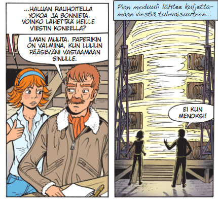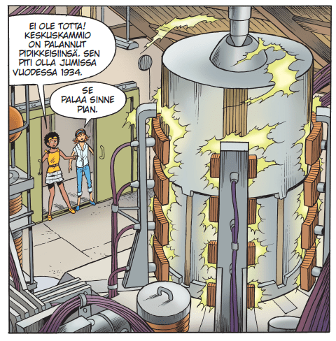 Olin kääntänyt kaksi Yokoa ennen tätä työtä, eikä kumpikaan niistä ollut aikakonetarina. Sain siis selvittää aikakoneiden osien suomenkieliset nimitykset aiemmista käännöksistä – ”aikakoneiden” monikossa, koska näköjään niitä on sarjassa kahta eri sorttia: Monyan sulavalinjainen kikotin, joka on tuttu esimerkiksi albumista Matka halki aikojen, ja sitten tämä Ametistin kirouksessa nähty 30-luvulla kehitetty paksu pönttö. Monyan kone esitellään totta kai albumissa, jota ei ole vielä suomennettu, joten en tiedä selviäisikö tarinasta, onko laite kehitetty vuosituhansien saatossa tästä alkeellisesta varhaisversiosta vai ovatko ne täysin erillistä tekniikkaa. MUOKKAUS: Kyseinen Monyan aikakoneen esittelevä albumi Ajan pyörre ilmestyy suomeksi keväällä 2021.