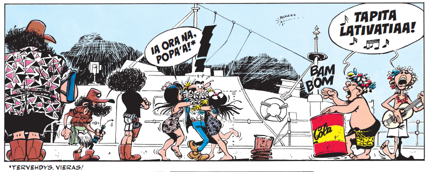 Toinen polynesialle spesifi piirre oli fiktiivinen kieli, jota paikalliset puhuivat. Kuten yleensä, nämäkin sanaleikit pelasivat sillä, että ranskan kirjoitus- ja ääntöasu poikkeavat selvästi toisistaan. Esimerkiksi yksi paikannimistä oli Papa Lapavu (papa l’a pas vu = isä ei ole nähnyt sitä/häntä). Näissä vitseissä varsinaiset sanat eivät liity kontekstiin (ei ole väliä, kenen isä näki jotakin tai ei), vaan pelkkä samankuuloisuus riittää. Listasin alkutekstistä tällaisten vitsien kielipiirteitä: mitä vokaaleja ”kielessä” esiintyy (esim. ê), mitä konsonantteja, millaisia tavuja ja miten monta tavua sanassa. Sitten aloin miettiä, millaisia piirteitä suomalaisessa versiossa tästä kielestä olisi. Siitä jäisi väistämättä pois b:t ja f:t, kun niitä ei suomessa esiinny, mutta suomen tyypillinen tavutus (kaksi kirjainta, konsonantti + vokaali) sekä diftongit sopivat hommaan erinomaisesti. Ongelma oli vain siinä, että sanaleikin piti kuulostaa riittävän vieraalta toimiakseen vieraana kielenä eikä vain normaaleina suomen sanoina (esim. Tomuta Lakana, kun huomioidaan jälleen, ettei lukemista avittavia isoja kirjaimia erota sarjisfontista). On haaste nojata kielitajuunsa kielissä, joita ei ole oikeasti olemassa ja joiden esikuvina toimivia kieliä ei osaa.